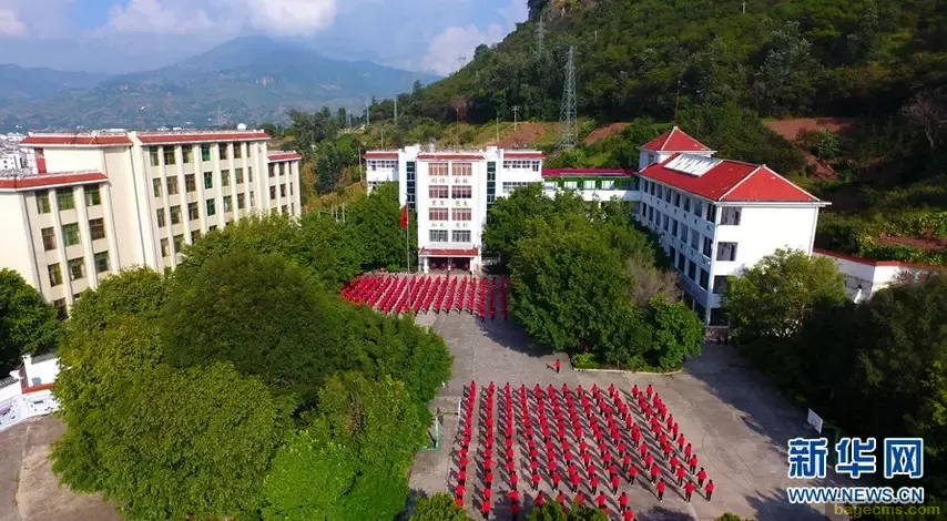 航拍视角下的华坪女子高级中学,以及正在做课间操的员工们。