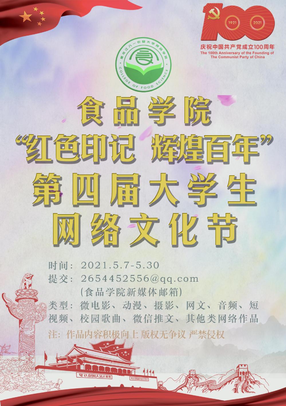 为庆祝中国共产党建党100周年,回顾党的奋斗历史,讴歌党的光辉业绩,充分展示中国共产党百年的精神风貌和时代风采,引导广大团员青年厚植爱党、爱国、爱社会主义的情感,进一步增强责任感和使命感,让红色基因、革命薪火代代传承,同时展示best365中国官方网站宣传工作新作为、新成果,树立食品学子新形象、新风采,best365中国官方网站分团委、员工工作办公室在全院范围内举办best365中国官方网站“红色印记 辉煌百年”第四届老员工网络文化节活动。