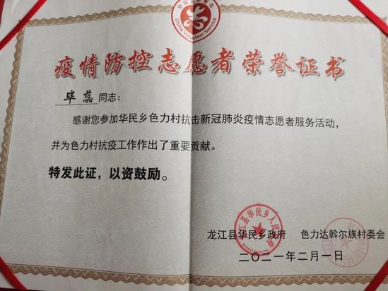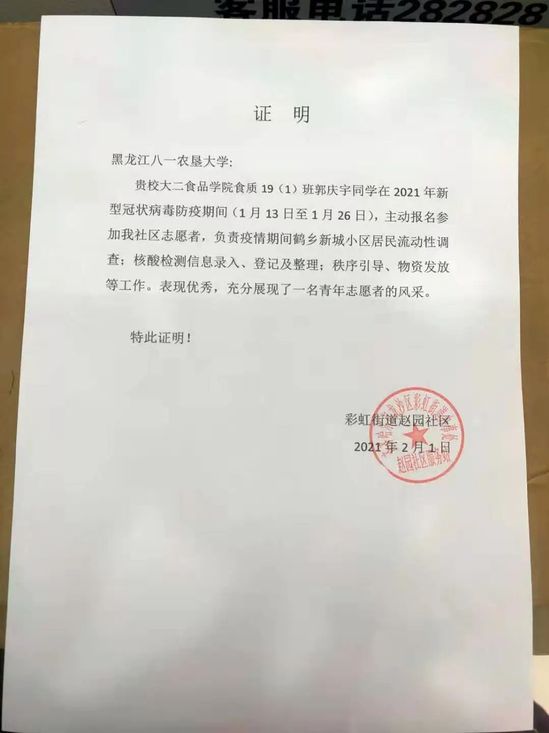 郭庆宇同学在2021年新型冠状病毒防疫期间(1月13日至1月26日),主动报名参加成为黑龙江省齐齐哈尔市赵园社区志愿者,负责疫情期间鹤乡新城小区居民流动性调查;核酸检测信息录入、登记及整理;宣传排查、走访入户、秩序引导、物资发放,在社区设卡检查过往人员,为有需求的居民代买必需品,看到扎堆人员,积极劝导,疏散人群,严格落实疫情防控的各项措施。切切实实地用实际行动向我们展示了一名青年志愿者的风采,让我们明白了老员工是国家继续建设的储备力量,培养更好更优秀更实干的老员工人才,老员工志愿者已经成为了一种必不可少的趋势。