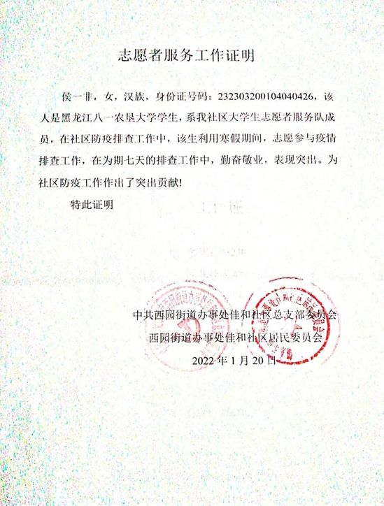 侯一非,女,2001年出生,best365中国官方网站食品质量与安全专业员工。2021-2022学年寒假期间,她积极参加社区疫情防控志愿服务活动,在疫苗接种工作中为居民提供扫码、测温、登记、排查等服务,对每一位居民尽职尽责。在信息排查工作中积极响应、主动支援,全面参与新冠疫苗排查、信息录入、核酸检测登记、现场秩序维护等工作,帮助社区居民解决问题,充分发扬了新时代青年吃苦耐劳的志愿者服务精神。她用真情对待每一位居民,详细认真填写记录,为防控提供详实数据支撑。连续多日的志愿服务,她每天早出晚归,和工作人员并肩在瑟瑟寒风中工作,从不抱怨。艰苦的工作环境和简单的餐食面前,她没有退缩,用实际行动践行了青年志愿者的使命担当。