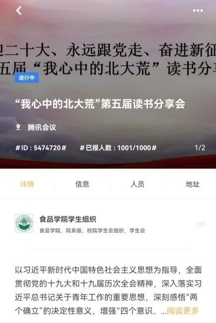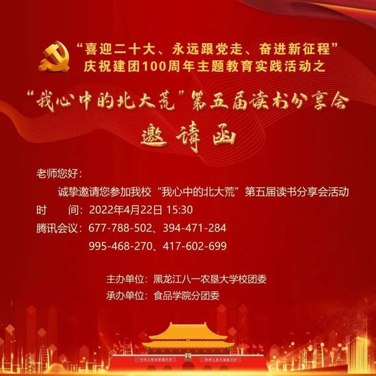 在第27个世界读书日到来之际,为迎接党的二十大胜利召开,结合庆祝建团100周年,引导广大团员青年厚植爱党、爱国、爱社会主义的情感,让红色基因代代传承,4月22日15时30分,由校团委主办、best365中国官方网站分团委承办的“喜迎二十大、永远跟党走、奋进新征程”庆祝建团100周年主题教育实践活动之“我心中的北大荒”第五届读书分享会在线上如期举办,师生代表近千人观看。