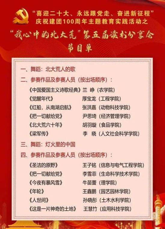 本次活动历时两个月,参与同学根据个人兴趣自主选择一本关于党团的经典著作、北大荒题材经典文学著作进行精读,若干本进行泛读,同时撰写读书笔记。经过班级读书分享会、学院读书分享会以及社团读书分享会等,各学院共推选出12组参赛选手参加校级读书分享会,最终评选出最佳风采奖、最佳创意奖、最佳表现奖等奖项。