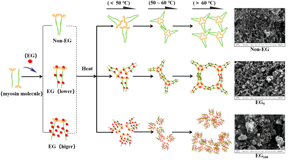 本团队基于前期的研究,发现丁香提取物能够显著抑制肌原纤维蛋白(MPs)羰基的形成,改善溶解性和热稳定性,并提高MPs的凝胶形成能力。其中丁香提取物中主要成分是丁香酚(EG)(67.6%),EG作为一种天然抗氧化剂已应用于肉类工业。通过研究不同含量(0、5、10、20、50、100 mg/g)EG 对MPs结构特性和凝胶行为的影响,发现EG在低浓度(低于20 mg/g)下,提高了凝胶强度和弹性,并减少了MPs的蒸煮损失。然而,在高浓度(超过20 mg/g)下,尤其是在100 mg/g下,EG对MPs凝胶有负面作用,MPs凝胶显示出粗糙的微观结构,具有大量可见的孔隙,这是由于过度的蛋白质与蛋白质或EG与MPs相互作用造成的。总的来说,EG对MP凝胶化的影响是高度依赖浓度的。因此,在肉制品中加入适当浓度的EG,不仅可以实现良好的抗氧化效果,还可以促进MP凝胶化,从而获得质地良好、感官上理想的肉制品。