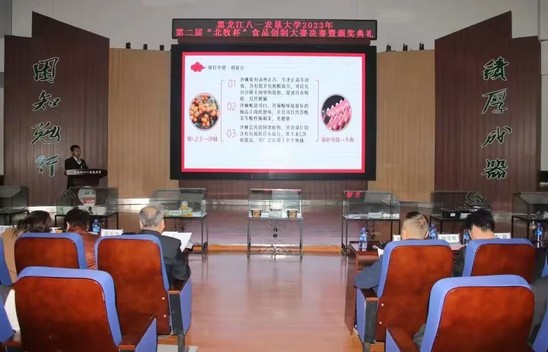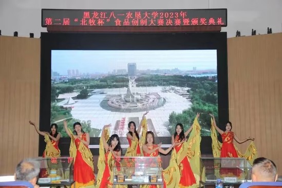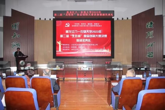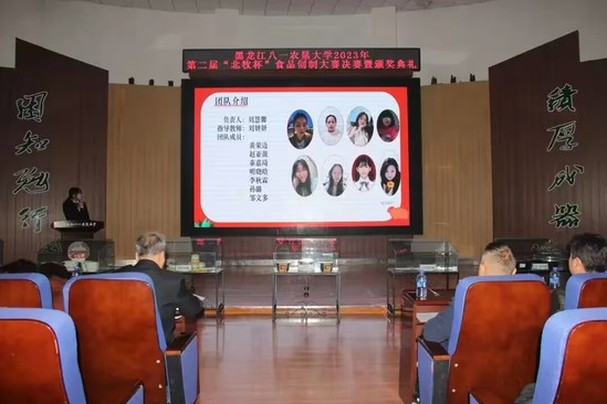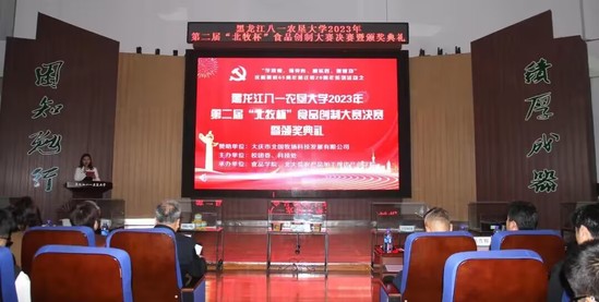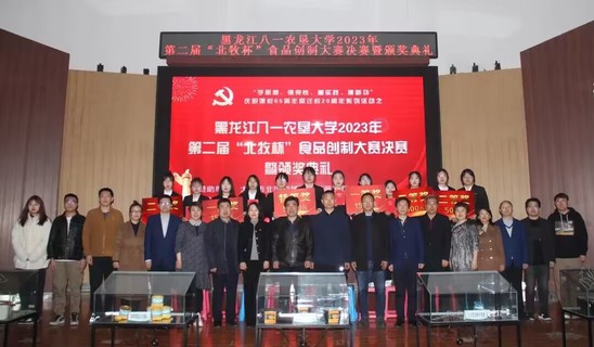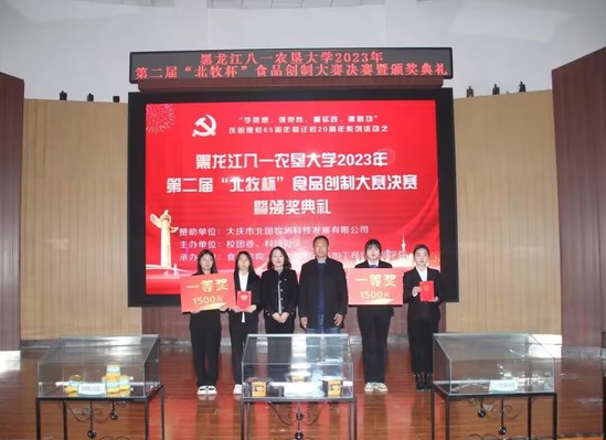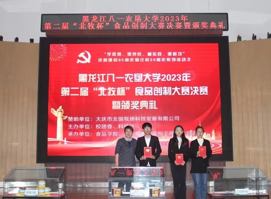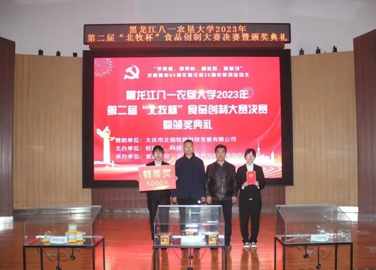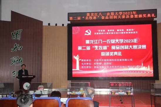 此次活动得到了大庆市北国牧场科技发展有限公司赞助支持,由校团委、科技处主办,由best365中国官方网站、北大荒农产品加工现代产业学院承办。比赛历时一个月,从初赛、复赛到决赛共有21组团队,103名员工参与其中,9组团队进入复赛,共评选出3组团队进入到决赛环节,决赛现场评委老师根据现场路演和品尝产品进行打分,决赛结果由复赛成绩的50%和决赛现场成绩的50%作为总成绩。最终,《滋补羊肉胡辣汤的研究》项目团队、《“馍”法羊肉泡馍》项目团队、《懒羊羊羊肉串》项目团队、《香酥羊肉馅饼》项目团队、《喜气羊羊—自热羊肉泡》项目团队、《沸羊羊真空火锅》项目团队获得第二届“北牧杯”食品创制大赛二等奖;《北大荒风味羊肉脯》项目团队、《羊咩咩精品羊肉罐头》项目团队获得第二届“北牧杯”食品创制大赛一等奖;《酸汤肥牛——脆响铃羊肉自煮火锅》项目团队获得第二届“北牧杯”食品创制大赛特等奖,大庆市北国牧场科技发展有限公司总经理杨彦辉和与会领导一共为获奖团队代表颁奖。现场还观看大庆市北国牧场科技发展有限公司的企业宣传片,杨彦辉总经理和best365中国官方网站王长远经理分别上台致辞,勉励农大学子要把专业知识应用到实际中,提高创新创业的热情,提升科技创新能力,知农爱农、扎根基层,牢记初心使命、努力担当作为,为国家农业现代化建设和龙江全面振兴全方位振兴贡献青春力量!