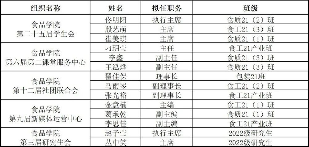 为加强各员工组织员工骨干选拨任用工作的民主监督,现将拟任名单向全院公示,公示期自2023年9月19日至2023年9月21日。对上述拟任命人员如有异议,可在公示期内向学院分团委反映。如无异议,以上14名同学将从9月22日起进入试用期,试用期为一个月。