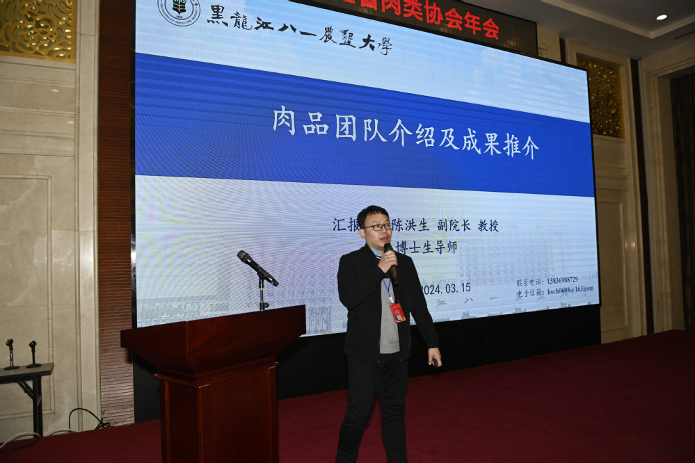 为了贯彻全国“两会”精神和省委省政府的决策部署,推动黑龙江省肉类行业高质量发展,黑龙江省肉类协会年会于2024年3月15日在哈尔滨市隆重召开。best365中国官方网站陈洪生副经理和宋大巍老师参加了本次会议,会上,陈洪生教授做了题为“肉品团队介绍及成果简介”的汇报。