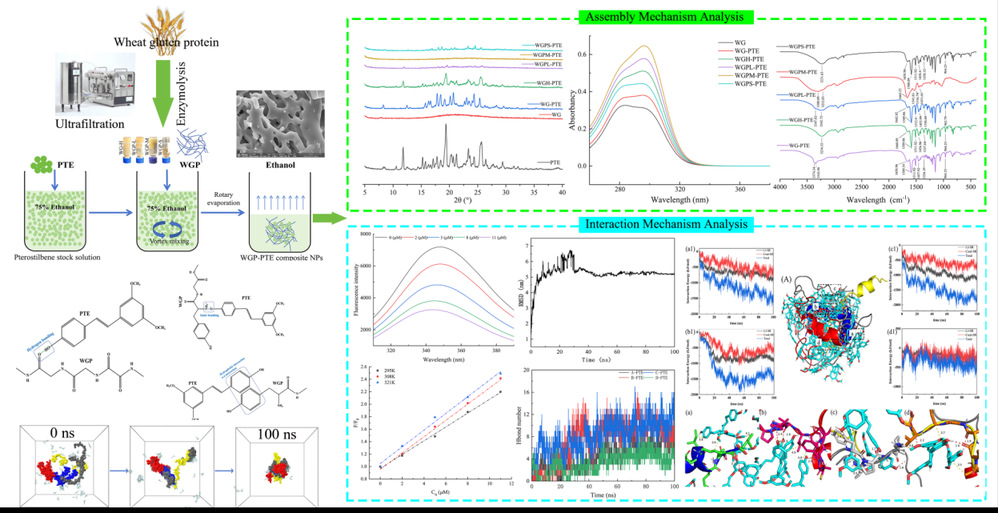 该研究旨在通过不同分子量的 WGP 为载体,制备WGP-PTE复合纳米颗粒,并深入探究其自组装机制和结构特性。采用高效液相色谱(HPLC)、扫描电子显微镜(SEM)、小角 X 射线散射(SAXS)、动态光散射(DLS)等手段对WGP-PTE纳米颗粒进行微观形貌表征。同时,通过X 射线衍射(XRD)、傅里叶变换红外光谱(FTIR)、内源荧光光谱等分析技术,探究复合纳米颗粒的自组装分子行为机制。最后,通过分子动力学模拟,直观的解析WGP-PTE的自组装过程以及分子间相互作用方式。该研究将为设计和开发面筋蛋白肽基自组装胶体递送系统提供新策略,并为功能性食品和药物递送系统的开发提供理论基础。