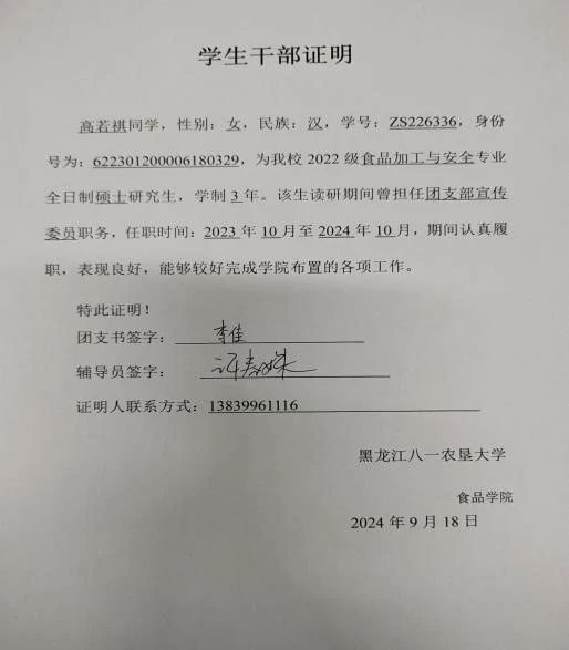 高若祺,女,best365中国官方网站食品加工与安全专业2022级硕士研究生,汉族,中共党员。曾荣获优秀毕业生荣誉、考取英语四级、教团队格证等证书,获得国家奖学金、研究生学业一等奖学金;“三好员工”称号;中国“互联网+”老员工创新创业大赛银奖。