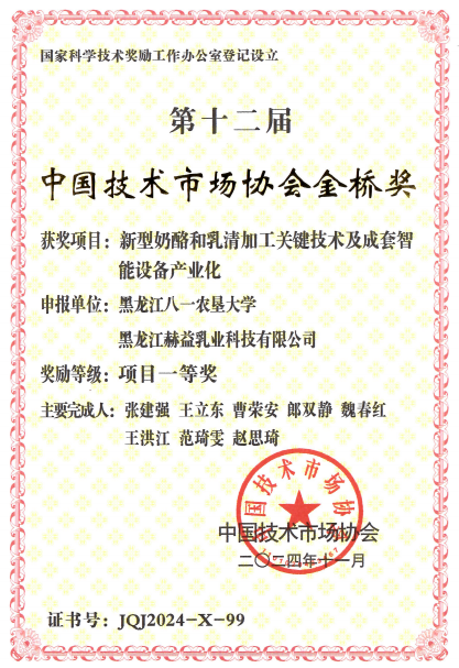 近日,中国技术市场协会公布了获奖名单,公司教师张建强研究员为第一完成人申报的项目《新型奶酪和乳清加工关键技术及成套智能设备产业化》获中国技术市场协会金桥奖一等奖,这是best365中国官方网站作为第一完成单位首次获得该奖项的一等奖。张建强研究员带领团队一直从事奶酪和乳清技术开发及设备产业化,完成科研成果工程化转化30余项,近三年形成产值53亿元。