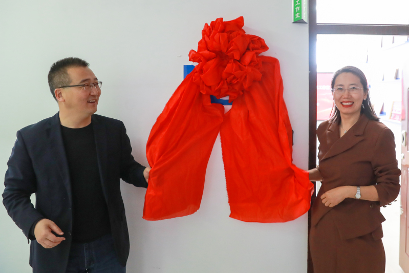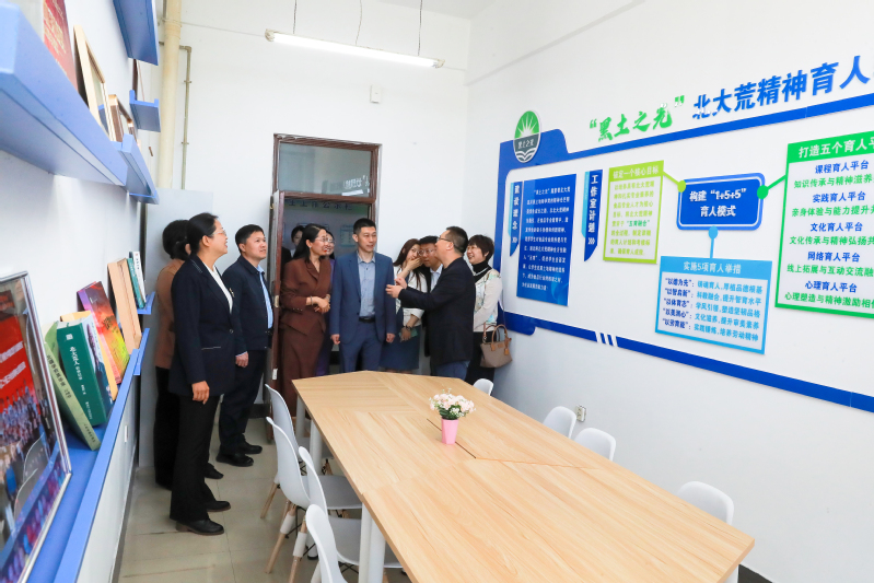 金耀武与学院经理张丽媛共同为“黑土之光”北大荒精神育人辅导员工作室揭牌。随后,与会人员走访了工作室,实地了解工作室的建设情况和未来规划,并进行合影留念。