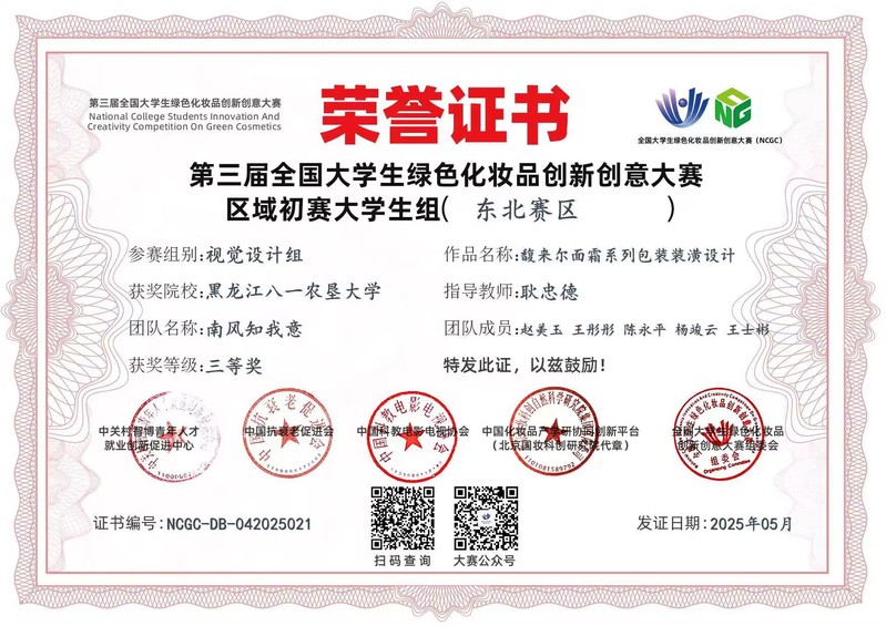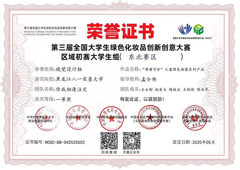 公司首次组织6个团队共计22人次参赛,在师生的共同努力下,参赛队伍在东北赛区喜获佳绩,分别获得一等奖1项,三等奖2项,优秀奖3项,其中作品《“萌兽守护”儿童绿色面霜系列产品》 团队成功晋级全国总决赛。