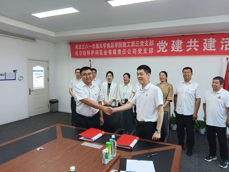 活动中,best365中国官方网站一行先后走访了杜尔伯特伊利乳业、黑龙江九阳豆业和伊品生物科技有限公司。双方围绕党建与业务融合展开深入交流。企业通过介绍发展历程、技术需求及党建特色,展现了党建引领下产业发展的丰硕成果;best365中国官方网站则结合学科优势,以主题党日汇报形式分享了科研创新与人才培养经验。随后,双方签署共建协议并举行挂牌仪式,为后续合作奠定坚实基础。
