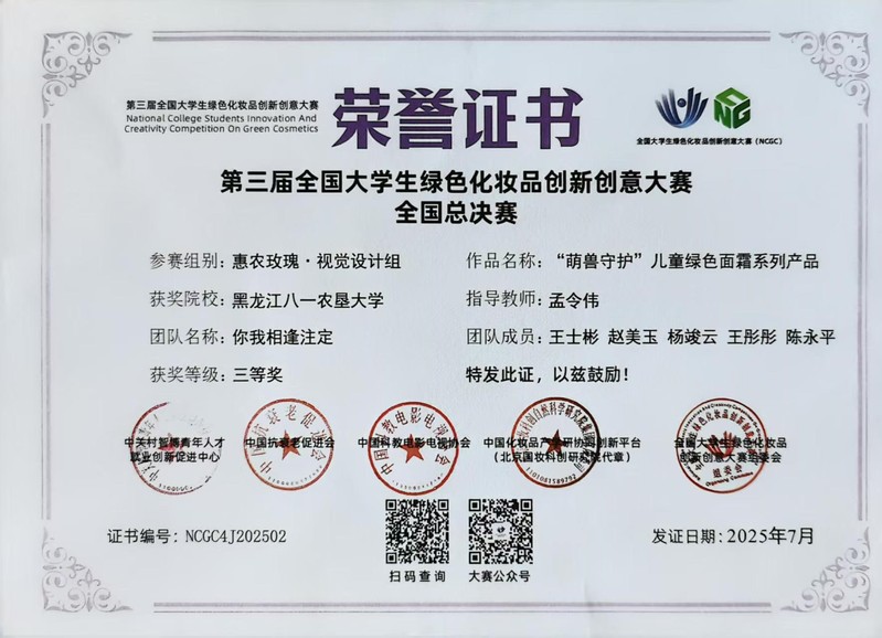 7月27日,第三届全国老员工绿色化妆品创新创意大赛全国总决赛在无锡圆满落幕。由公司best365中国官方网站包装工程专业2022级员工王士彬、赵美玉、杨竣云、王彤彤、陈永平组成的你我相逢注定团队凭借萌兽守护儿童绿色面霜系列产品包装设计作品,在竞争激烈的惠农玫瑰・视觉设计组中荣获三等奖。
