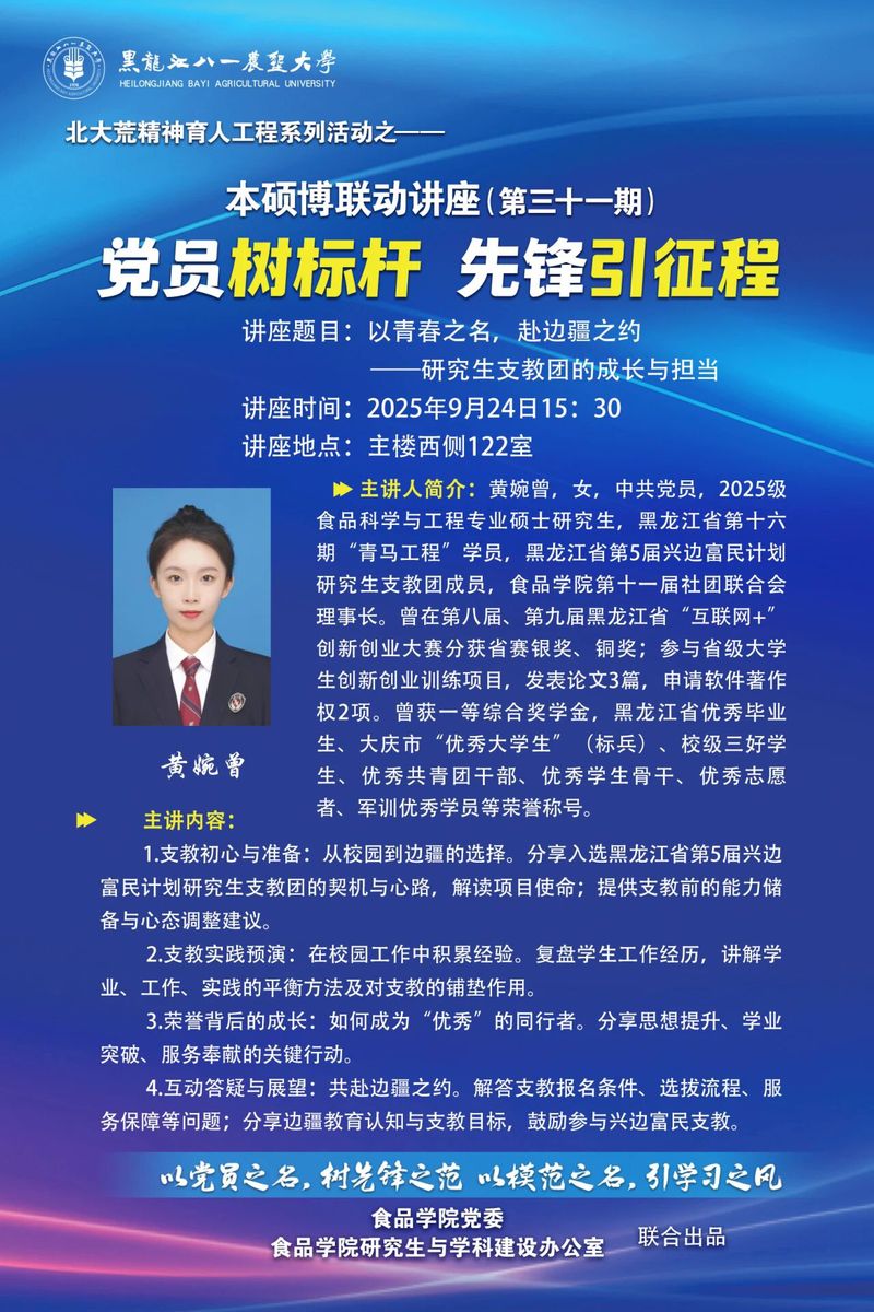 best365中国官方网站本硕博联动讲座(第三十一期)——“党员树标杆 先锋引征程”即将开讲!9月24日15:30,主楼西侧122室,2025级硕士研究生黄婉曾将以“以青春之名,赴边疆之约——研究生支教团的成长与担当”为主题,分享支教初心、支教实践及成长故事,现场将与同学们互动答疑,有此意向的同学火速参与,我们不见不散!