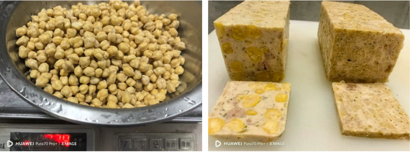杂粮包括杂粮和杂豆。杂豆是多种豆类的统称(如鹰嘴豆、红豆、绿豆等),富含植物蛋白、膳食纤维、维生素B族、矿物质(如铁、镁、钾)以及抗氧化物质。本产品基于杂粮和杂豆的特殊营养功能,采用鹰嘴豆、红豆、绿豆等豆类与猪肉或鸡肉混合,制成特殊风味和口感的杂粮火腿。杂粮火腿产品的动植物蛋白均衡,氨基酸组成合理,富含膳食纤维,低盐低脂肪,更符合消费者对于健康食品的需求。本产品推广应用后经济效益显著,对于促进杂粮精深加工、提升杂粮产品附加值,推动肉类加工产业化、规模化发展意义重大。