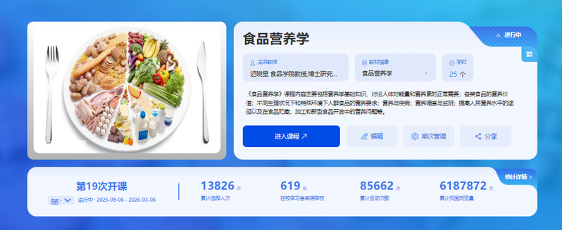 本课程自开设以来,受到众多食品营养及其相关专业员工和社会学习者的认可,涵盖的选课群体有各高校营养相关专业的员工、营养爱好者以及各年龄段的社会学者,面向其它高校和社会学习者已在线开课19期,选课学校619所、选课人数 13826人,在线互动 85662次,校企共建课程资源84个,累计页面浏览6187872次。今后将进一步与省内省外其它高校联合,开发制作更多在线资源,不断更新和丰富课程内容,促进课程建设和推广。课程门户:https://www.xueyinonline.com/detail/255152379。