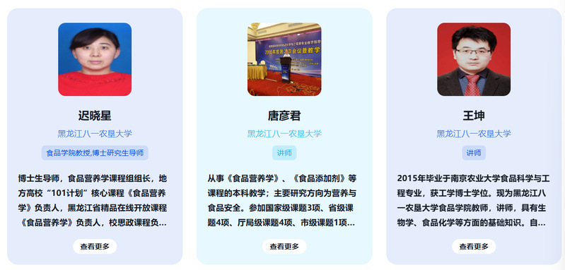 《食品营养学》是食品质量与安全、食品科学与工程、食品营养与检验教育、粮食工程等专业的一门专业基础必修课。课程内容主要包括营养学基础知识,讨论人体对能量和营养素的正常需要;各类食品的营养价值;不同生理状况下人群食品的营养要求;营养与疾病;营养调查与监测等。《食品营养学》课程创新了校内校际课程共享与应用模式,获得了2017年省精品开放课程。在线课程建成以后,在教学资源、教学设计和评价体系进行了持续更新与迭代。利用在线课堂的优势,也进行了线上线下混合式教学改革。2023年《食品营养学》课程被遴选为黑龙江省食品科学与工程领域地方高校“101计划”基础学科和“四新”关键领域核心课程的建设课程。在课程建设过程中,注重科教融汇、拔尖人才培养以及课程思政的融入。在课程负责人迟晓星教授和团队成员唐彦君、王坤、宋雪健、王欣卉等老师认真学习研究了国内外优质在线开放课程的基础上,对教学内容进行了重构。