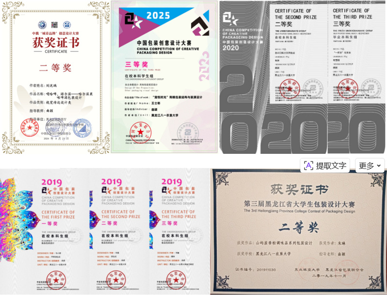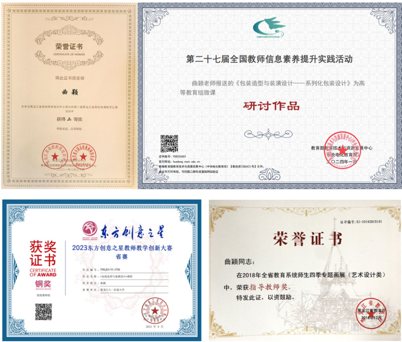 教师教学能力提升,同时推动教学效果的明显进步。课程负责人曲颖,荣获第八届黑龙江省高校微课教学大赛二等奖,校微课教学比赛一等奖。第二十七届全国教师信息素养提升实践活动研讨作品奖。2023年东方创意之星教师教学创新大赛省赛铜奖。黑龙江省教育系统师生四季专题画展(艺术设计类)指导教师奖。担任中国包装创意设计大赛专业评审委员。完成了《包装造型与装潢设计》校级“课程思政”课程建设项目,并参与编写轻工类教指委《包装造型与装潢设计》课程思政教学指南编写工作。