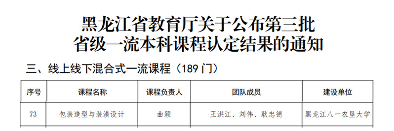 《包装造型与装潢设计》课程在学院的大力支持下,课程负责人曲颖和团队成员王洪江、刘伟、耿忠德老师在2019年完成校级慕课建设,并在泛雅平台上线,2020年在学银在线平台上线,2022年完成本课程校级 “课程思政”建设项目,2023年在国家高等教育智慧教育平台上线。并在2023年被评为黑龙江省第三批省级线上线下混合式一流本科课程。同年《包装造型与装潢设计》课程被遴选为黑龙江省食品科学与工程领域地方高校“101计划”基础学科和“四新”关键领域核心课程的建设课程。