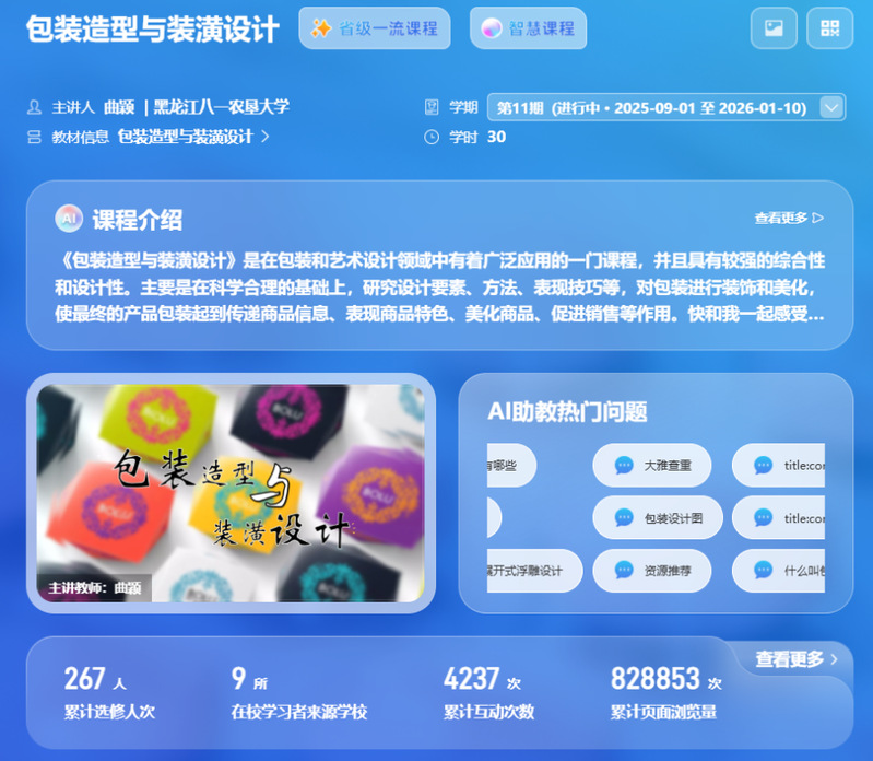 自2019年上线以来,《包装造型与装潢设计》课程利用超星平台不断完善课程内容和资源,将本课程内容分为教学视频、章节测验、教学课件、扩展学习、课程资料五个模块。目前线上教学视频36个,课程PPT36个,测验和作业习题595道,设计图例等课程资源881个。课程目前累计运行11期,学习人数267人,学习者来源学校9所,累计互动4237次,页面浏览量80多万余次,较好的帮助了员工根据自己的学习情况进行多次学习和复习,提高学习效果。同时拓展员工学习的广度和深度,为员工提供了较好的学习体验。体现了良好的示范推广效应,充分实现教育资源共享。
