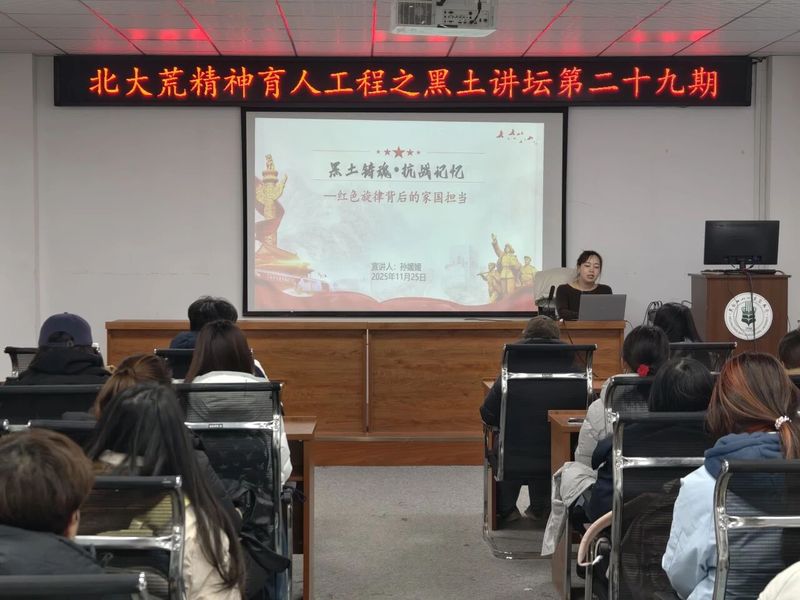 11月25日,黑土讲坛第二十九期在学院3058会议室如期举行。本期讲坛的主讲嘉宾,马克思主义学院孙媛媛老师以“黑土铸魂·抗战记忆——红色韵律背后的家国担当”为题,以经典歌曲《松花江上》为切入点,带领在场学子重温抗战岁月,系统解读抗战精神的内涵、实践脉络与时代传承。