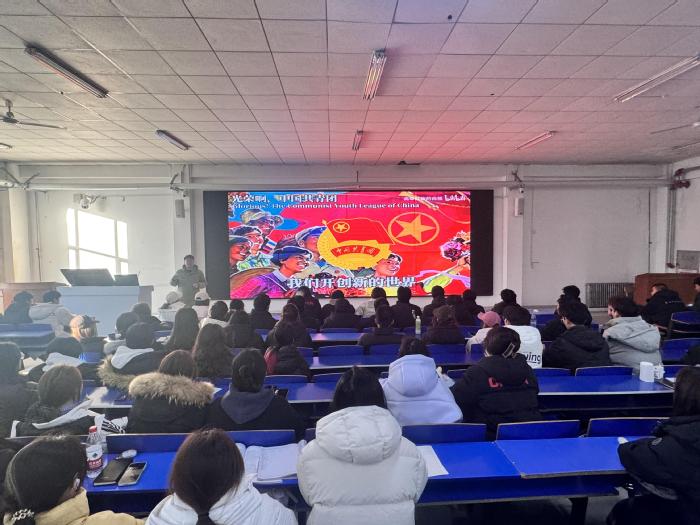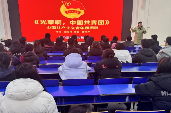 活动现场,张贺老师首先以“团歌里的青春担当与垦荒初心”为切入点,结合北大荒建设时期青年垦荒者“用青春献祖国”的奋斗故事,为团员青年解读《光荣啊,中国共青团》的时代内涵,让团员青年在理解团歌背景的同时,更深刻体会到青年与时代同频共振的责任。随后,开启团歌教唱环节,张贺老师结合美育教育理念,从旋律节奏、情感表达两方面入手,同学们认真学习,歌词熟记,旋律流畅,齐声高唱《光荣啊,中国共青团》,嘹亮的歌声中既有对共青团使命的坚定认同,也有对北大荒精神的传承之志,充分展现出best365中国官方网站青年团员的精神风貌。